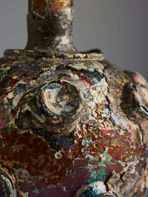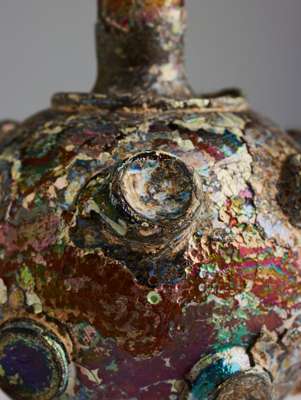 cut and applied glass, bulbous body standing on a disc foot, with thin neck and subtly out-turned rim, the body with applied discs and profuse iridescence