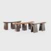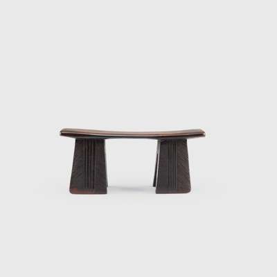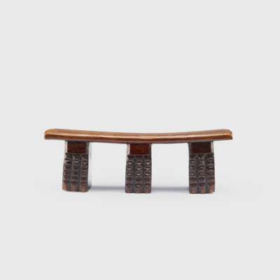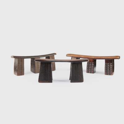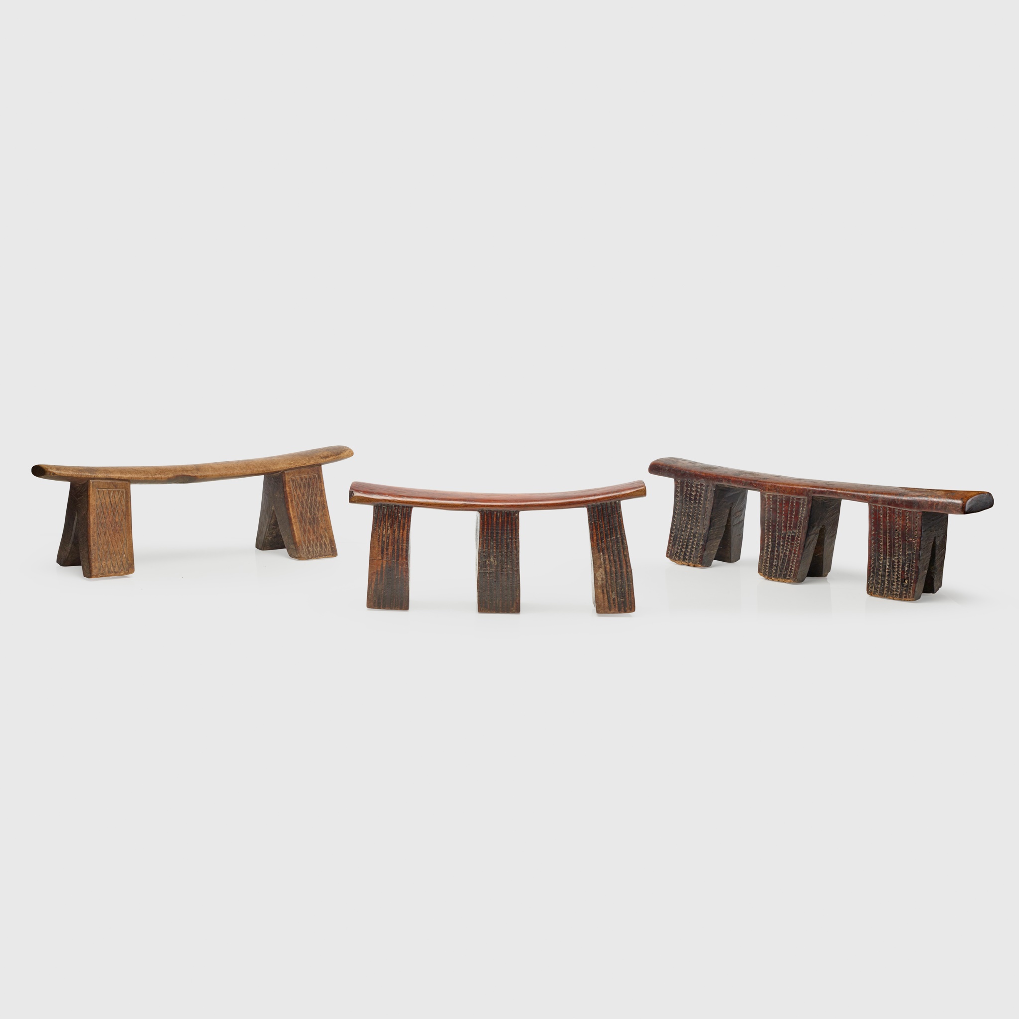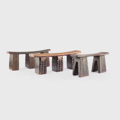 carved wood, each with a horizontal pillow and multi leg supports variously decorated with amasumpa and incised carving (6)