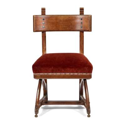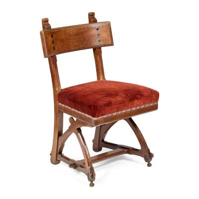 E.W. Pugin inherited his father's architectural practice and followed the same principles when designing furniture. This chair shows A.W.N. Pugin's preference for revealed construction in the pegs holding the legs and stretchers together. E.W. Pugin combined his father's ideas with new details of his own such as the broad back support.