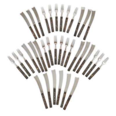 bronze and mixed metal, silver plated metal, comprising 18 forks, 18.7cm long; and 18 knives, 21.5cm long, within fitted mahogany box