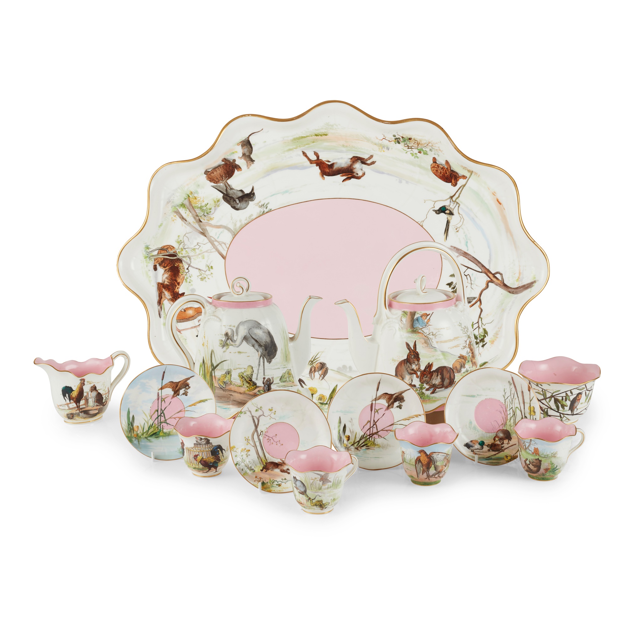 painted and printed porcelain, decorated with birds and animals, with gilt embellishments, comprising FOUR CUPS, 7.8cm diameter; FOUR SAUCERS, 12cm diameter; MILK JUG, 9cm high; SUGAR BOWL, 11.5cm diameter; TEAPOT & COVER, 22.5cm high; HOT WATER JUG & COVER, 19.5cm high; and TRAY, 62.5cm across