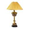 brass, with painted faux enamel decoration, on a black glass base with later fitting and pleated silk shade (converted from an oil lamp)