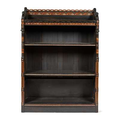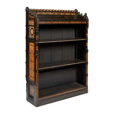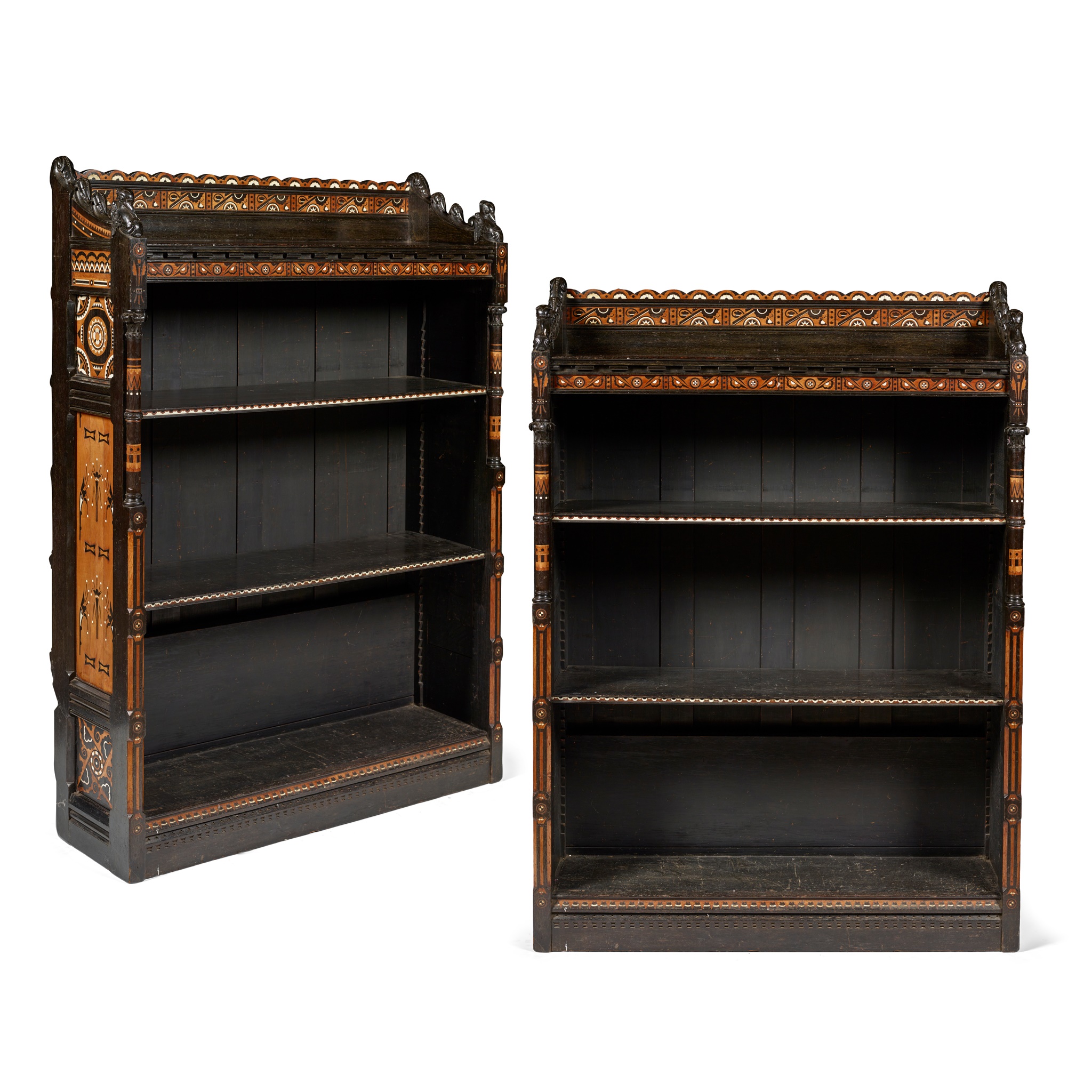 ebonised oak and fruitwood, inlaid with ebony and ivory, remnants of paper label to reverse of one bookcase