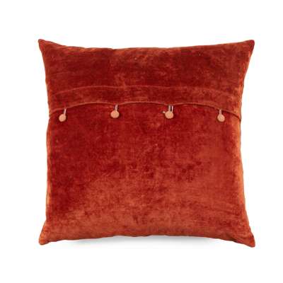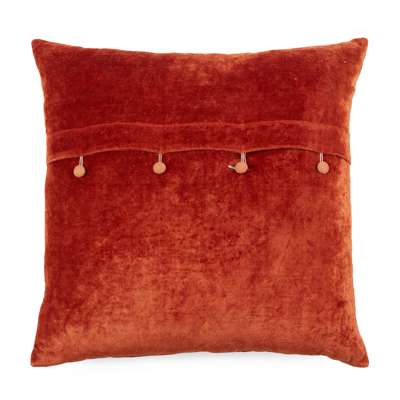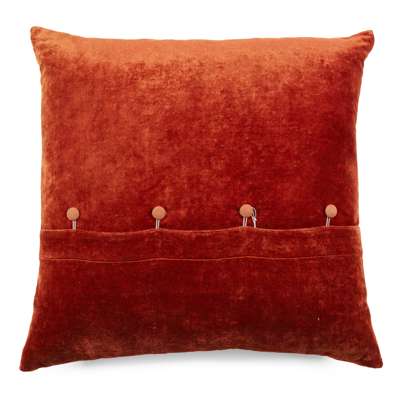 jacquard woven wool, reserved on russet velvet with applied braid, comprising a pair and another in a different colourway, each later made up as a cushion
