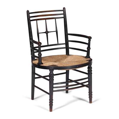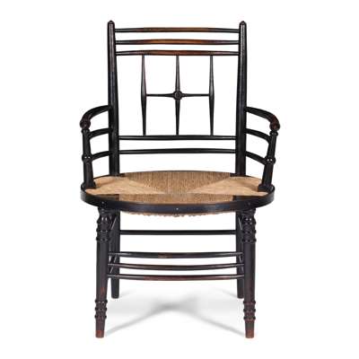 Note: Morris & Co.’s celebrated Sussex chair was originally designed around 1860 and sold in large numbers from the late 1860s. The form of this immensely popular piece takes its inspiration from a late-Georgian armchair discovered in Sussex, which is particularly visible in the turned frame and rush seat. The artist, Ford Madox Brown, was one of the original partners in Morris, Marshall, Faulkner & Co., the firm founded by William Morris and his friends in 1861. Although not known as a furniture designer, it is thought he suggested this version of the Sussex range, which was also sold as a side chair.