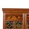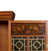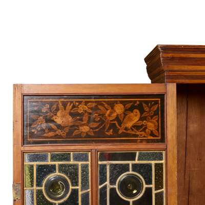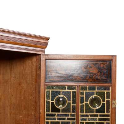 painted fruitwood, with patinated metal fittings, inset with ceramic tiles and coloured leaded glass, also painted to the interior