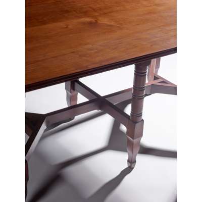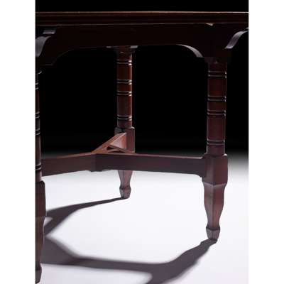 Note: George Washington Jack was the chief furniture designed for Morris and Co. from 1890. Prior to this in 1879, he had undertaken some work for the architect Philip Webb and by 1882 was a full-time employee of Webb’s. From 1885 Jack was working for Morris, Marshall, Faulkner and Co. as well as Philip Webb. There is a similar example of this table held in the William Morris Gallery Collection in Walthamstow (cat. no. G37). It is of comparable form, with hay-rake stretchers in the same arrangement and brackets supporting the overhanging table surface.
