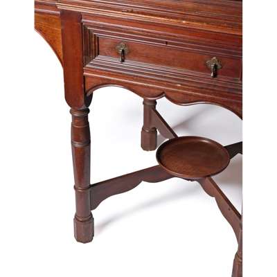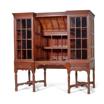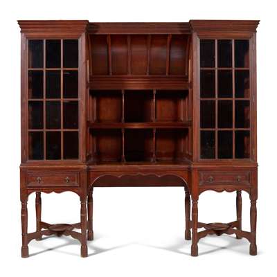 Note: The canopy over the central shelves recalls the canopy Philip Webb employed in the settle which he designed for his friend and associate William Morris' Red House, which subsequently moved to Kelmscott Manor. In keeping with Arts & Crafts values this cabinet recalls earlier historic forms, it is devoid of superfluous ornamentation and places an emphasis on the overall form, structure and materials used.