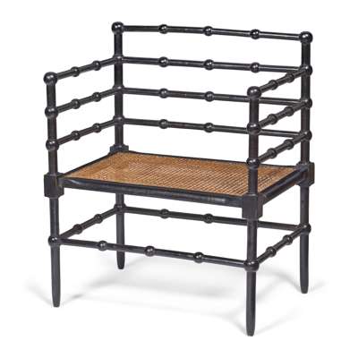 ebonised wood with caned seat and later upholstered silk velvet seat cushion