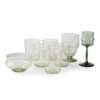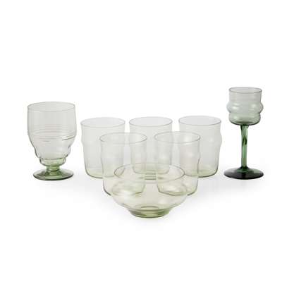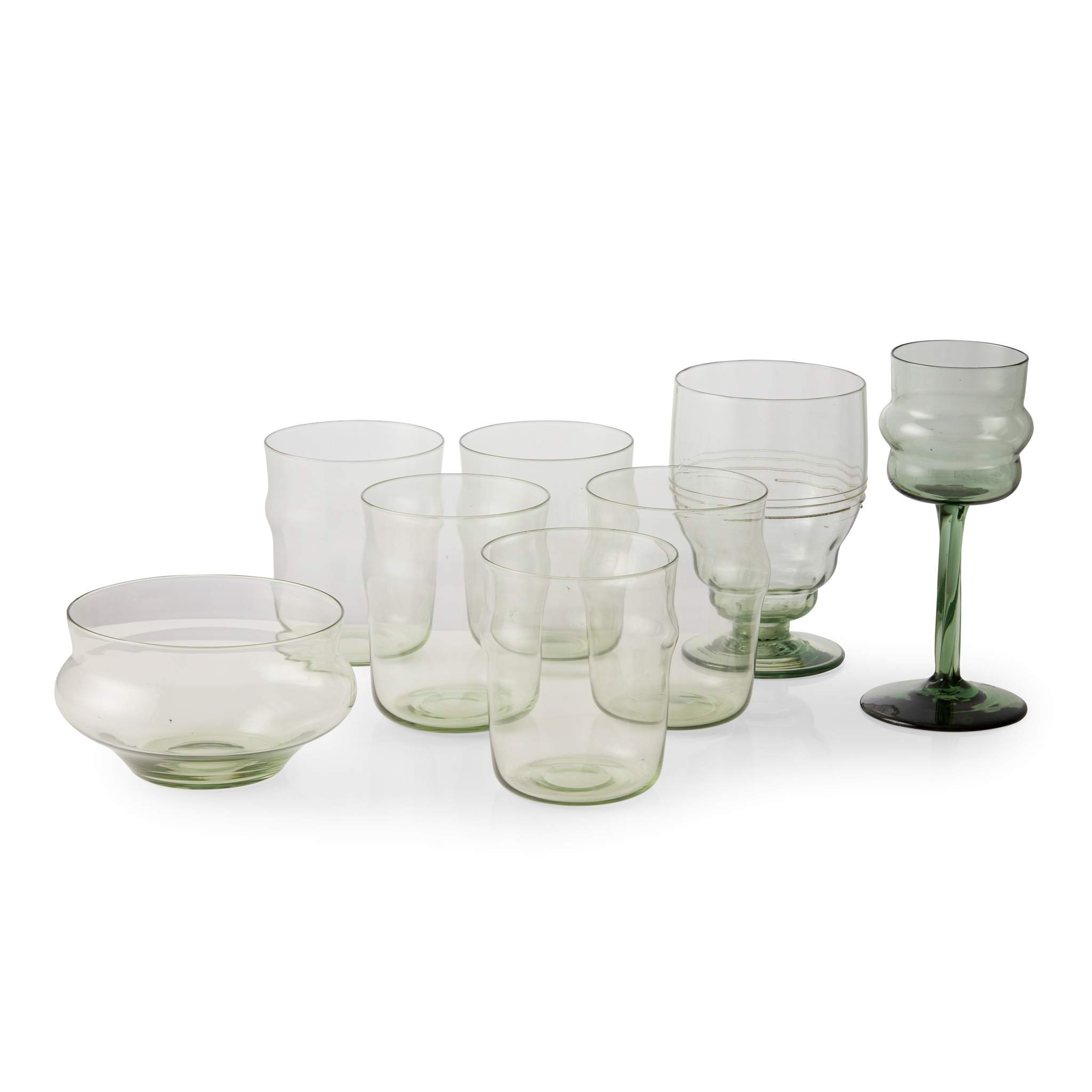 pale green glass, comprising FIVE TUMBLERS, 9cm high; a FINGER BOWL, 10cm diameter; a DRINKING GLASS, with trailed decoration, 11.5cm high; and a WINE GLASS, dark green glass, 14.2cm high