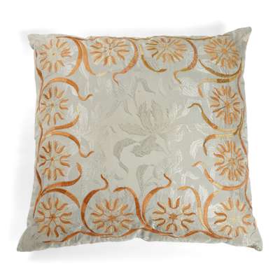 coloured silks, on a fine linen ground with later linen border and backing, 27cm x 38.5cm; together with an ENGLISH ARTS & CRAFTS EMBROIDERED CUSHION, THE FABRIC CIRCA 1900, coloured silks, on a silk damask ground, with later linen backing, 48cm square