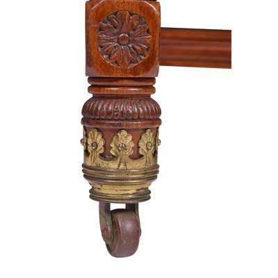 walnut, re-upholstered in period silk and wool woven fabric in the manner of B.J. Talbert or H.W. Batley, close-nailed, decorative brass caps and castors