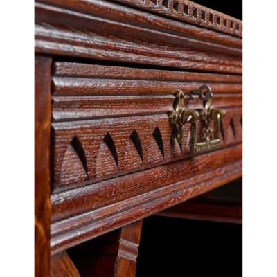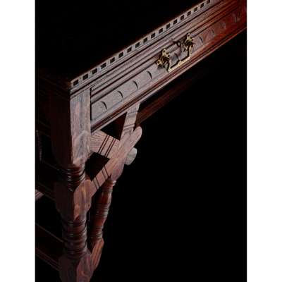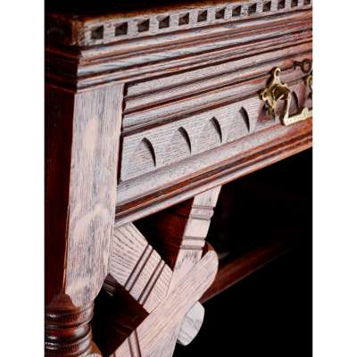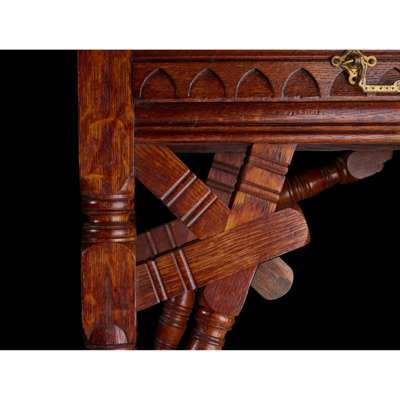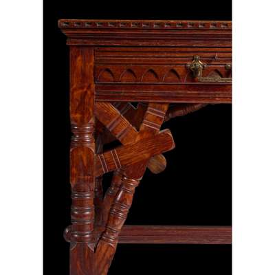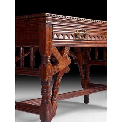 Note: Alfred Waterhouse is perhaps best remembered as the architect of the Natural History Museum in London. The furniture he conceived was for his own buildings. He designed all the furniture for the Earl of Selborne’s Blackmoor House in Hampshire and this current desk is similar in form and proportions to one created for the Earl.