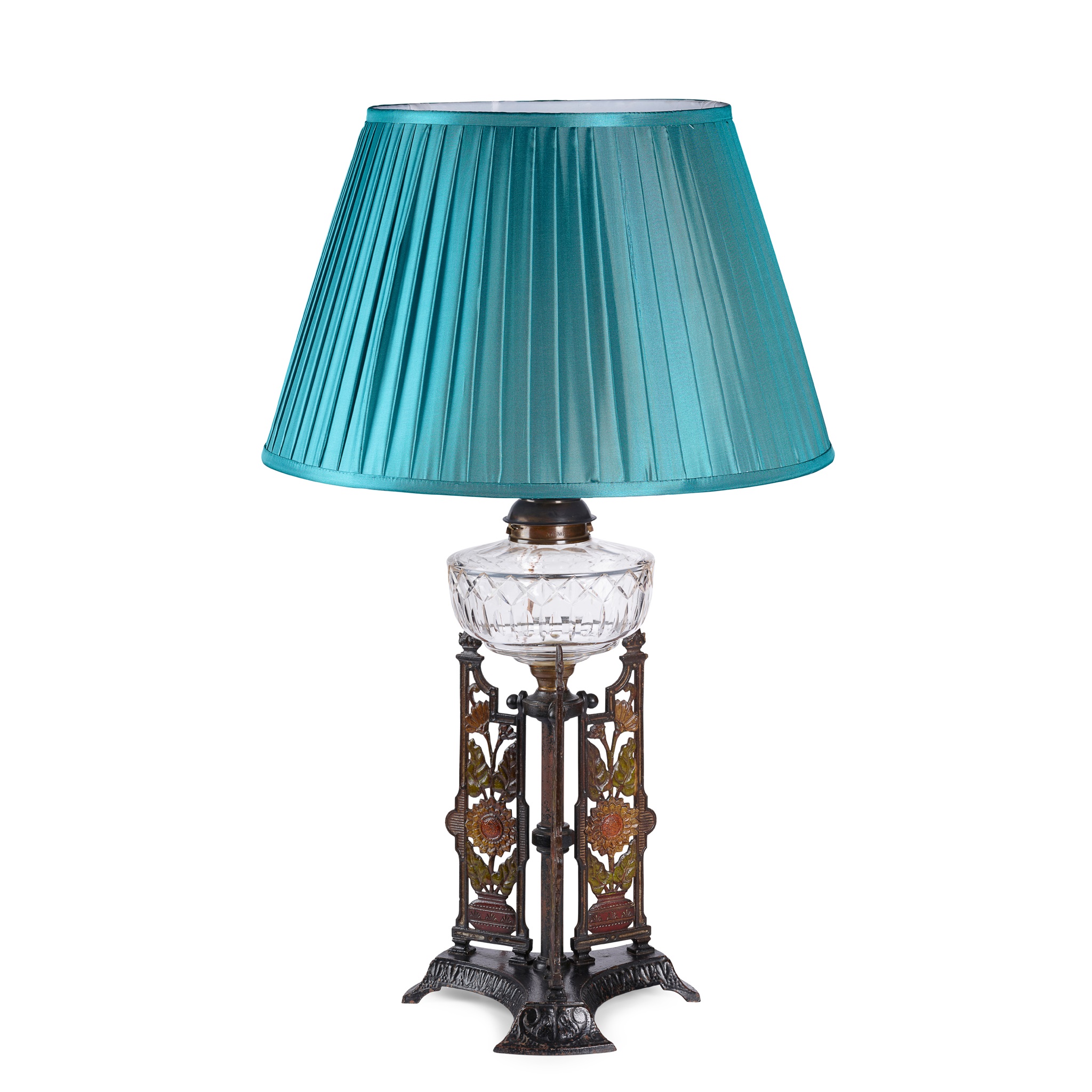 painted and cast metal, cut glass, converted to electricity and fitted with a later pleated silk shade