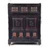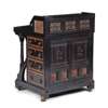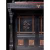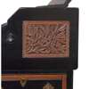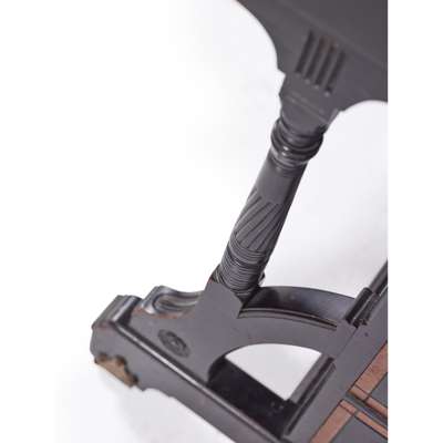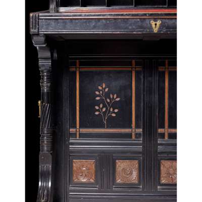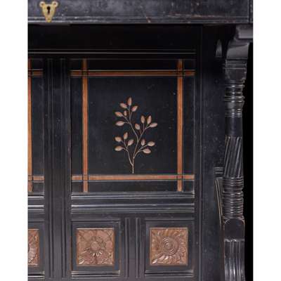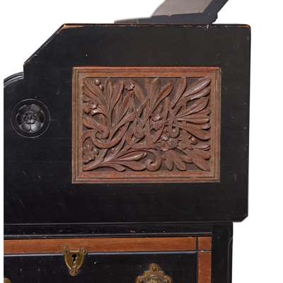 ebonised wood, inset with carved, inset with carved hardwood, tooled leather skiver and brass fittings, stamped under fall, LAMB 893 and to lock LAMB, M’CHESTER
