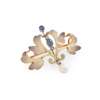 of scrolling foliate design, set at intervals with a small cushion-cut sapphire, an oval cabochon sapphire and rose-cut diamonds, with golden to lilac enamel ground and suspending a pearl drop, unmarked, in a fitted box for Tessiers ... London