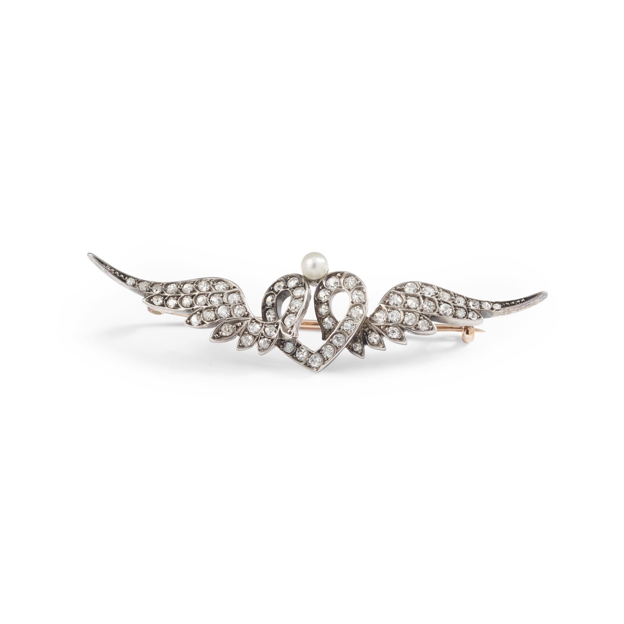 modelled as a winged heart, set throughout with graduated old round and eight-cut diamonds, set with a single bouton pearl, unmarked