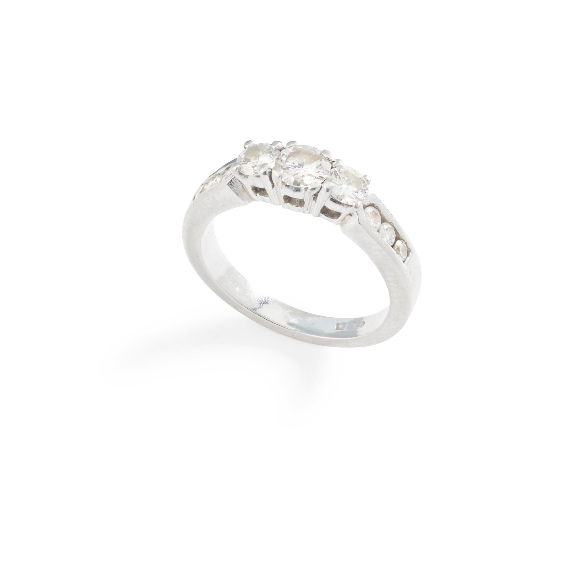 claw-set with three graduated round brilliant-cut diamonds, between channel-set round brilliant-cut diamond shoulders, mounted in platinum