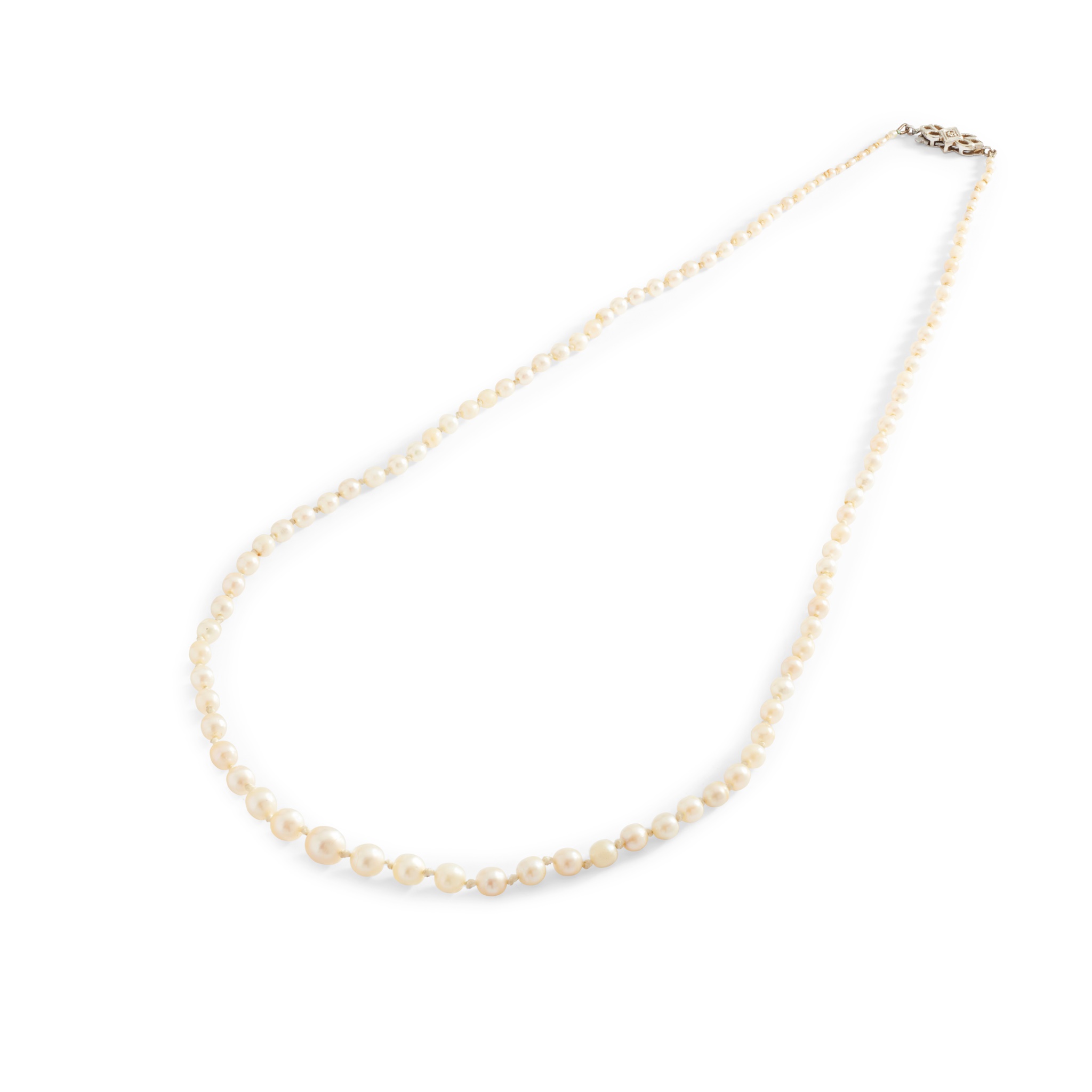 composed of a single strand of graduated pearls (untested), to a plain 9ct white gold clasp set with a single rose-cut diamond