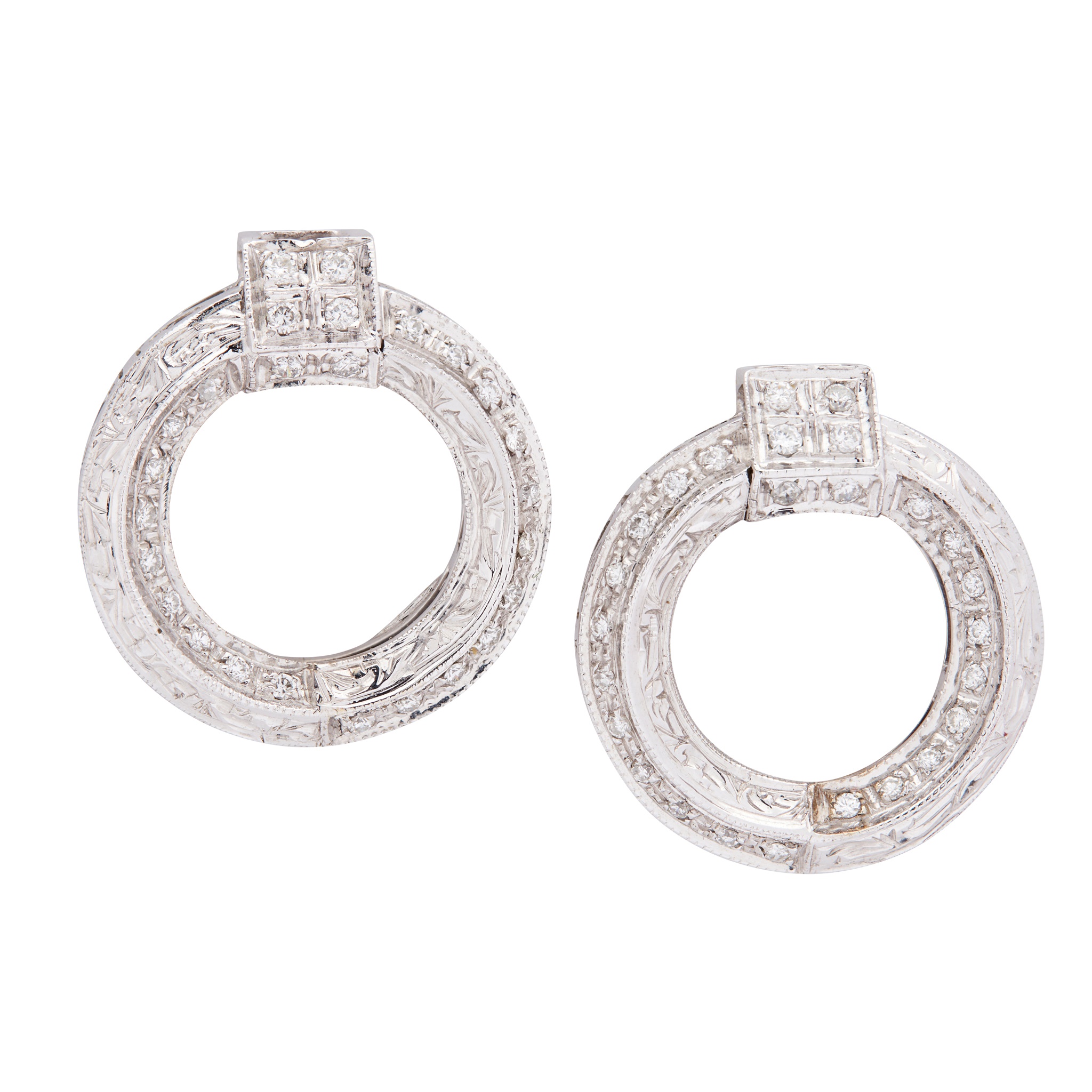 each modelled as a hoop with engraved detail, set throughout with graduated round brilliant-cut diamonds, stamped 750