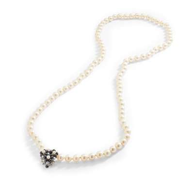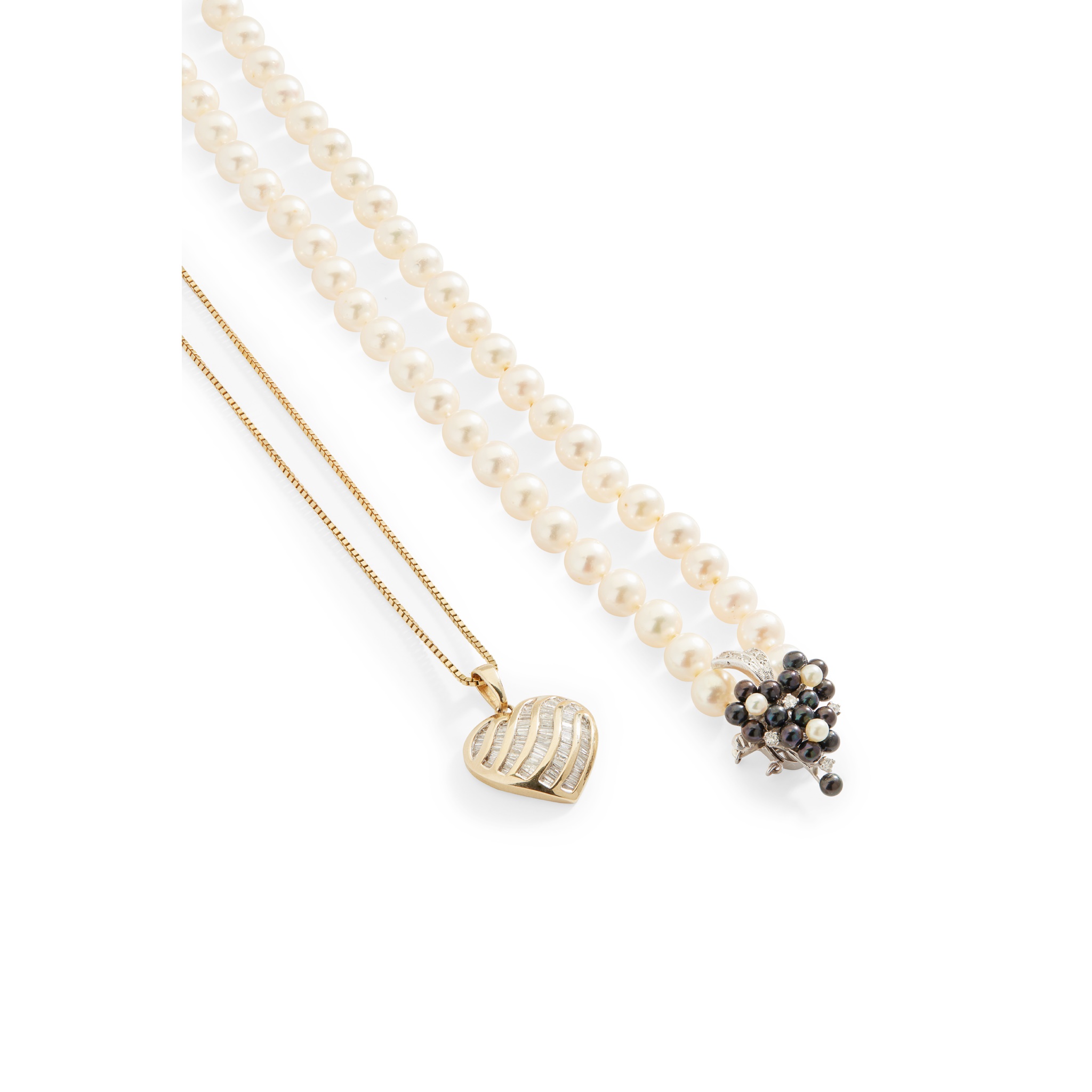 composed of a single strand of cultured pearls, the clasp modelled as a foliate spray, set with small black and white pearls and round-cut diamonds, stamped 14k; together with a baguette-cut diamond set heart pendant, stamped 10k