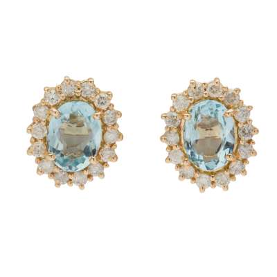 each claw-set with an oval-cut aquamarine in a border of round brilliant-cut diamonds, to post and butterfly fittings, unmarked