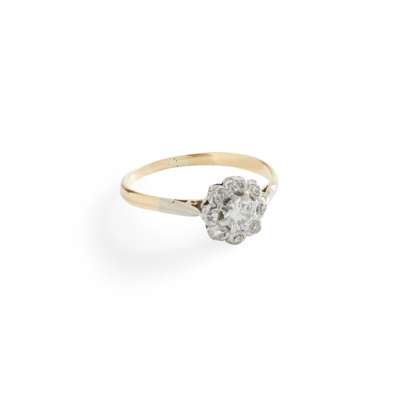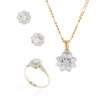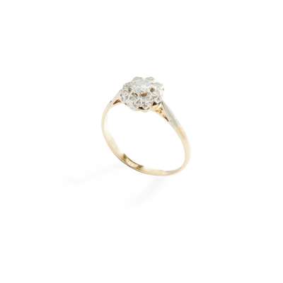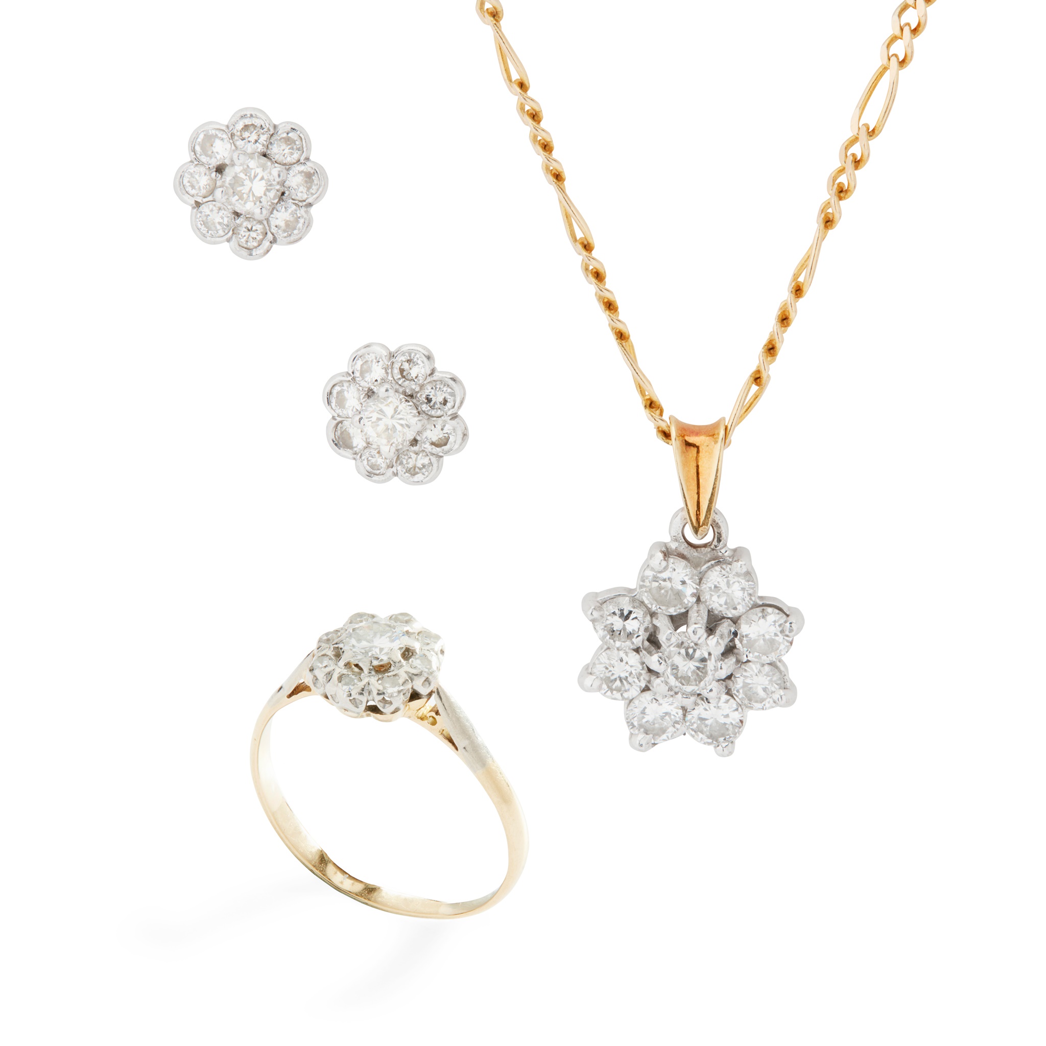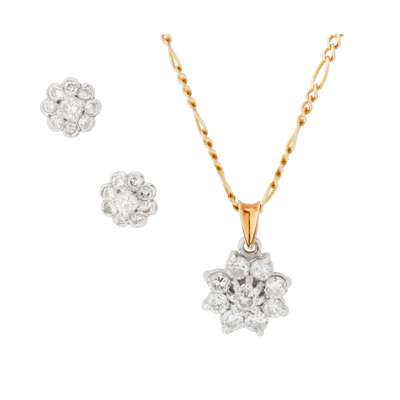 including an 18ct gold round brilliant-cut diamond cluster pendant, to a Figaro link chain, stamped 14k; a pair of 18ct gold round brilliant-cut diamond cluster earrings; and a round brilliant and eight-cut diamond cluster ring, unmarked