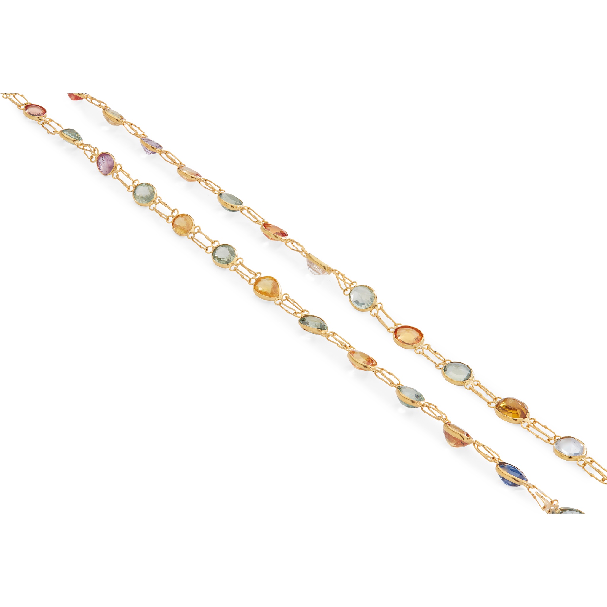 composed of a single strand of spectacle-set oval, pear and cushion-cut coloured sapphires, hook clasp, stamped 585