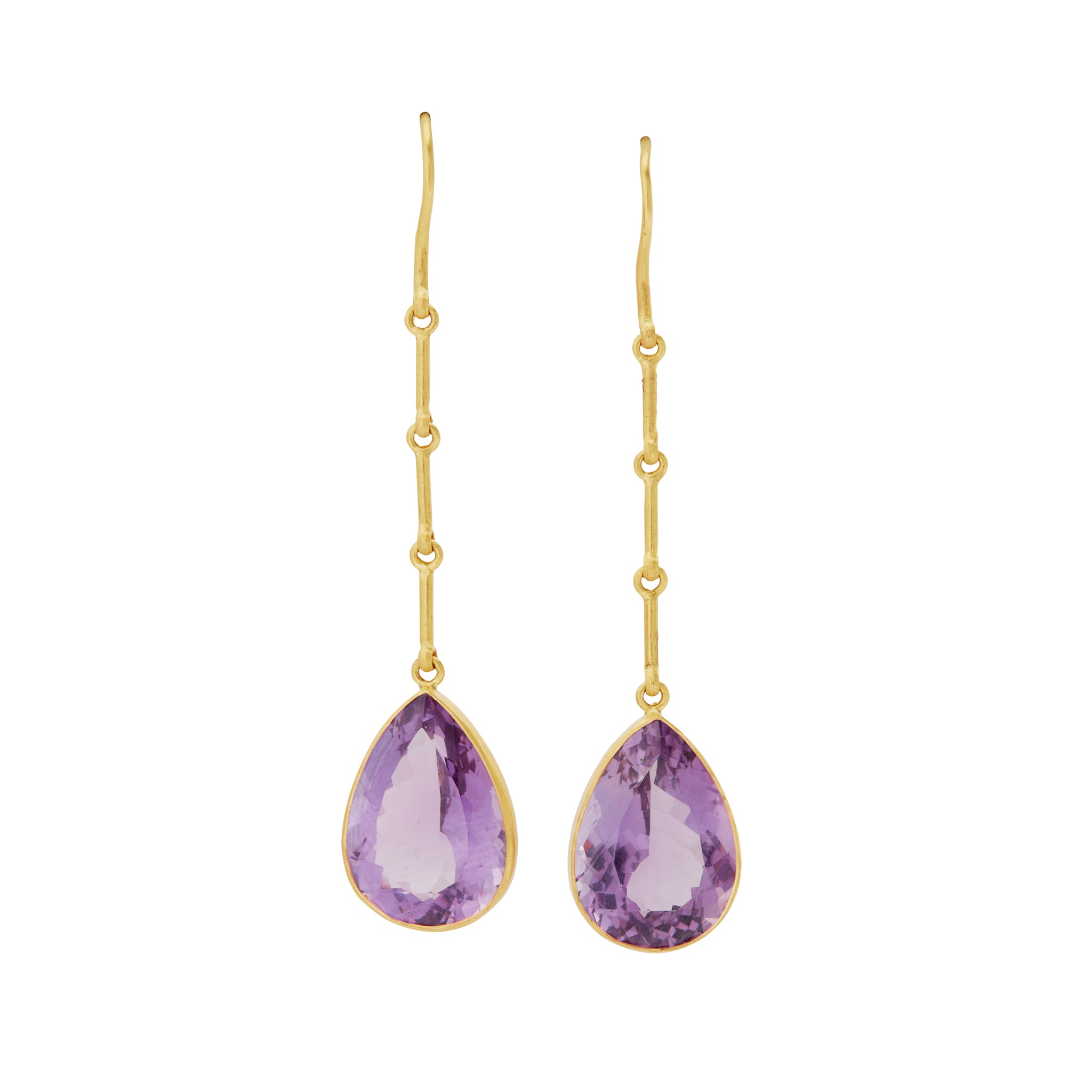 each collet-set with a pear-shaped amethyst, suspended from bar links to hook fittings, mounted in 18ct gold