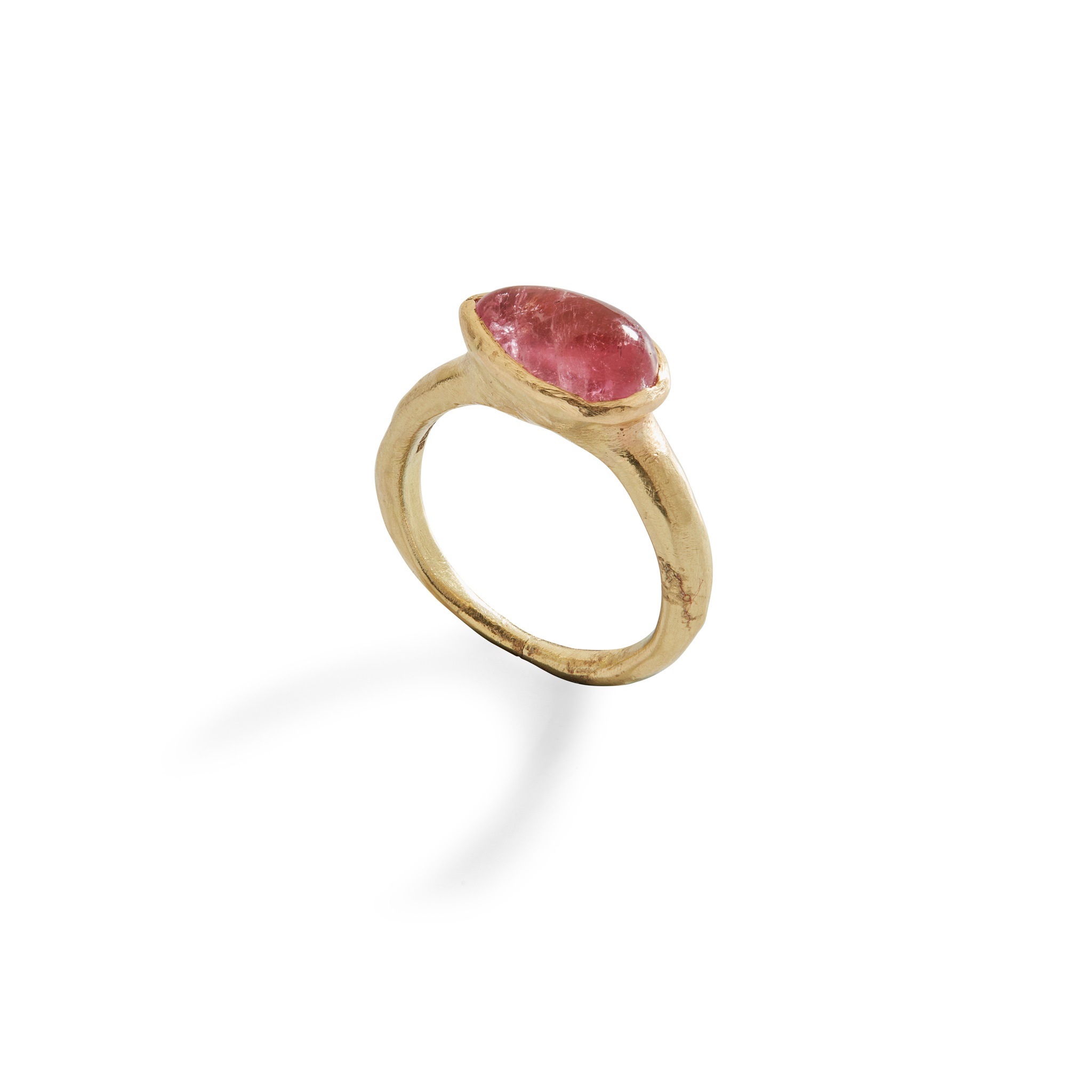 collet-set with a pear-shaped cabochon tourmaline, mounted in 18ct gold