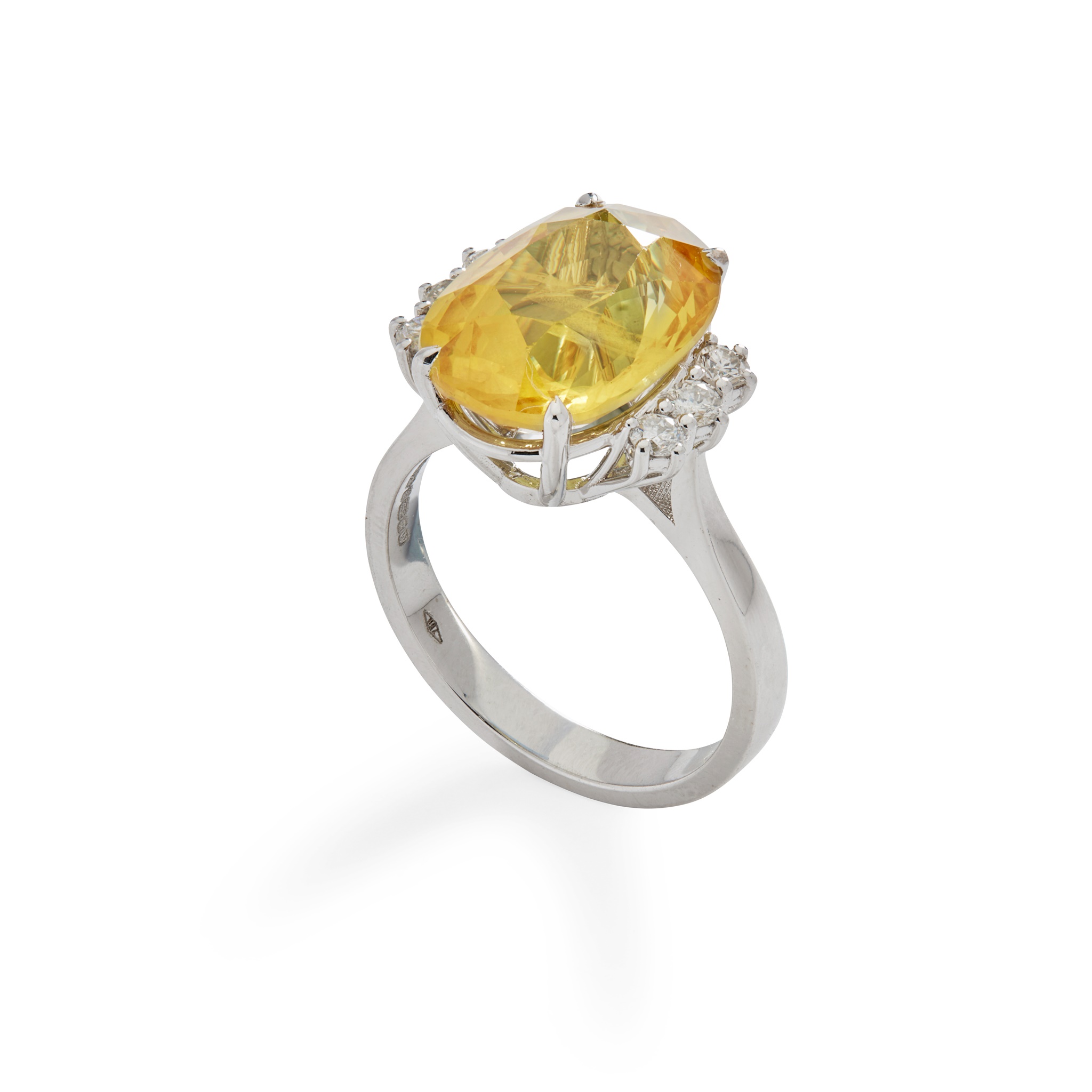 claw-set with an oval-cut yellow sapphire, each shoulder set with three round brilliant-cut diamonds, mounted in 18ct gold