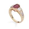 part collet-set with an octagonal step-cut ruby, flanked to either side by a square step-cut diamond, each shoulder channel-set with four baguette-cut diamonds, stamped 750