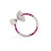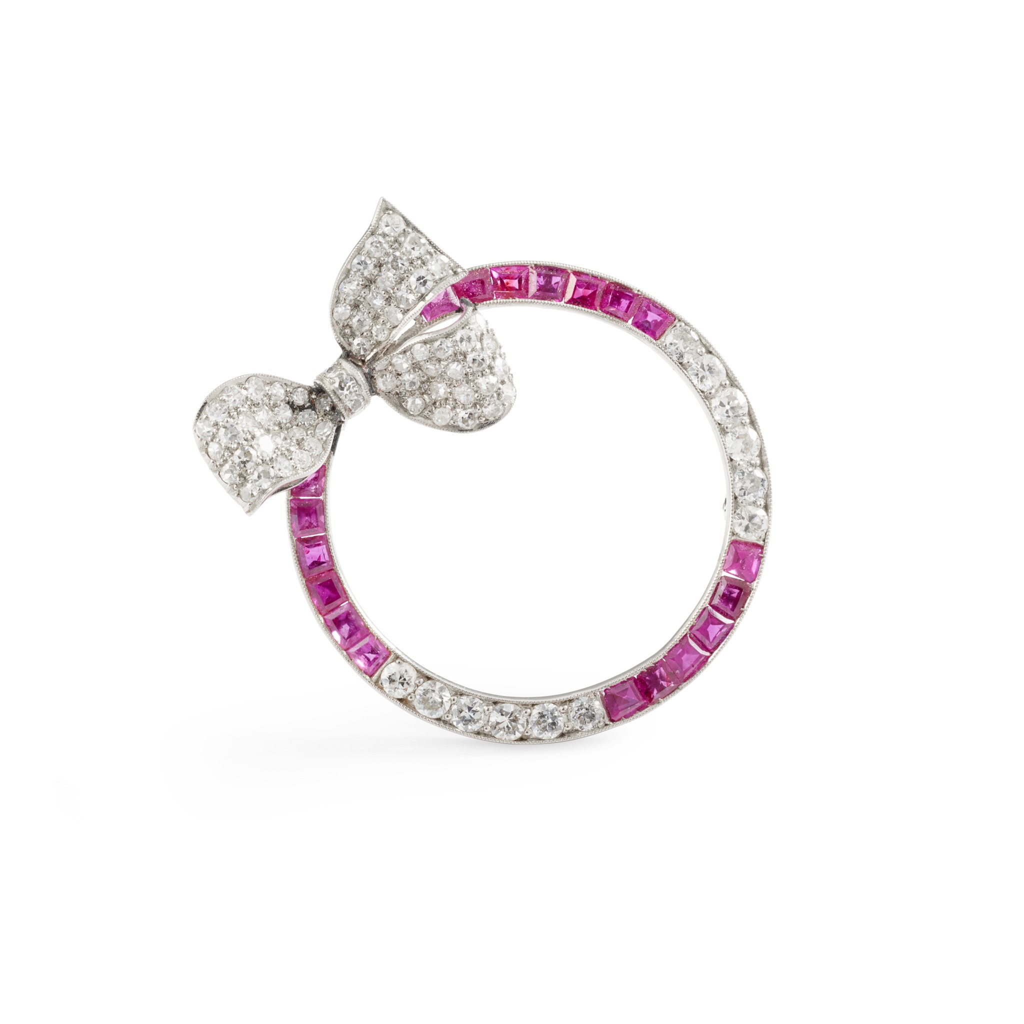 of circular outline, set with calibre-cut rubies and old round-cut diamonds, the applied bow motif pavé-set with eight-cut diamonds, unmarked