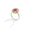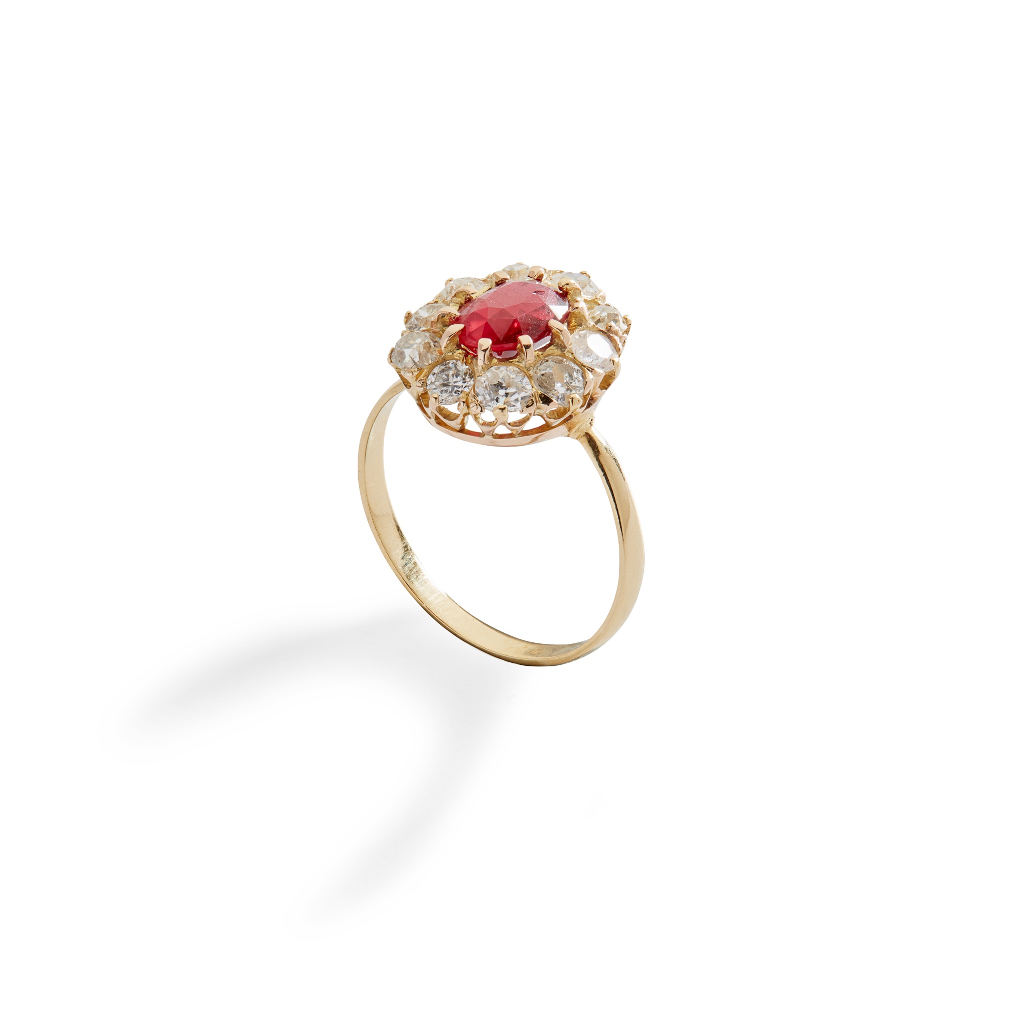claw-set with an oval-cut ruby in a border of old round-cut diamonds, unmarked