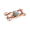 claw-set with a cabochon star-sapphire, in an open scrolling surround of red enamel, set at intervals with old round-cut diamonds, unmarked