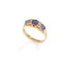 set with three graduated cushion-cut sapphires, between pairs of small rose-cut diamonds, mounted in 9ct gold