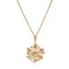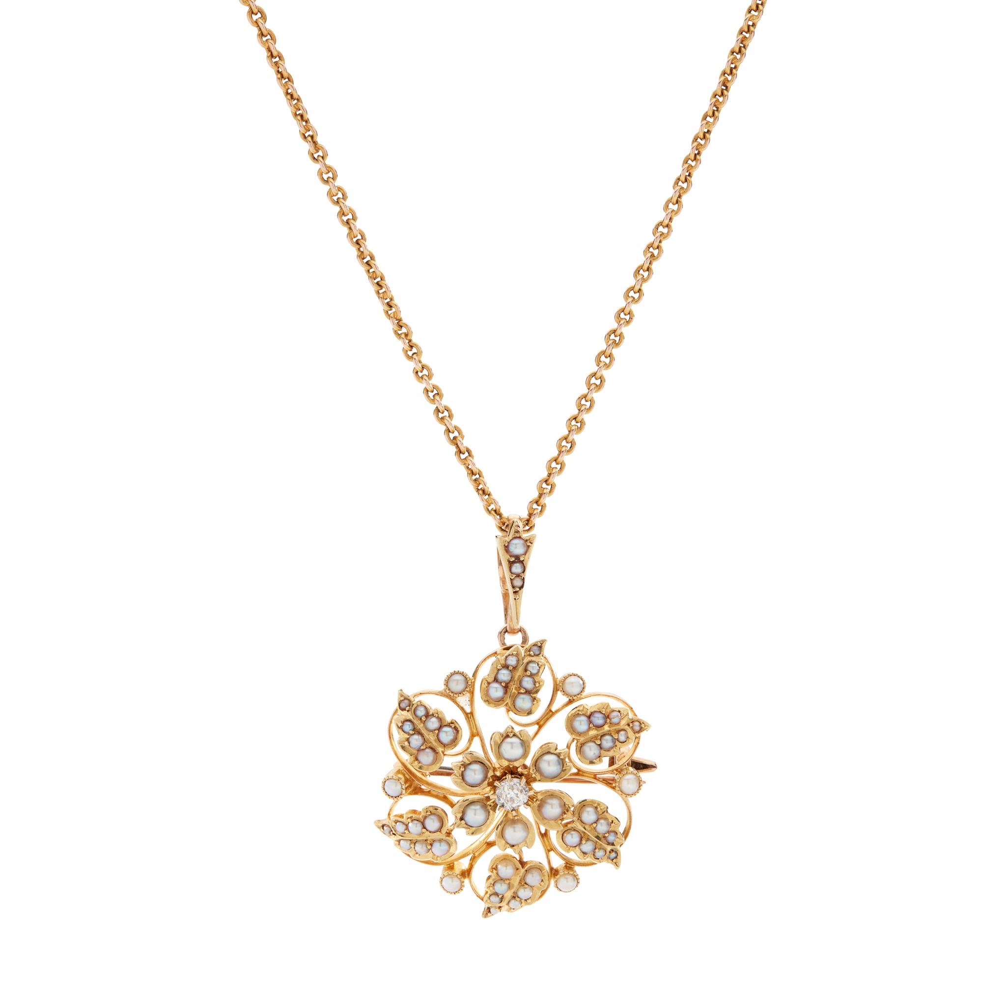of open foliate design, set throughout with seed pearls and a central old round-cut diamond, stamped 15ct; to an unmarked trace link chain