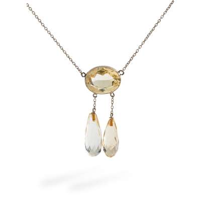 each set with a small round-cut peridot and small seed pearls, stamped 9ct; together with a citrine pendant necklace, unmarked