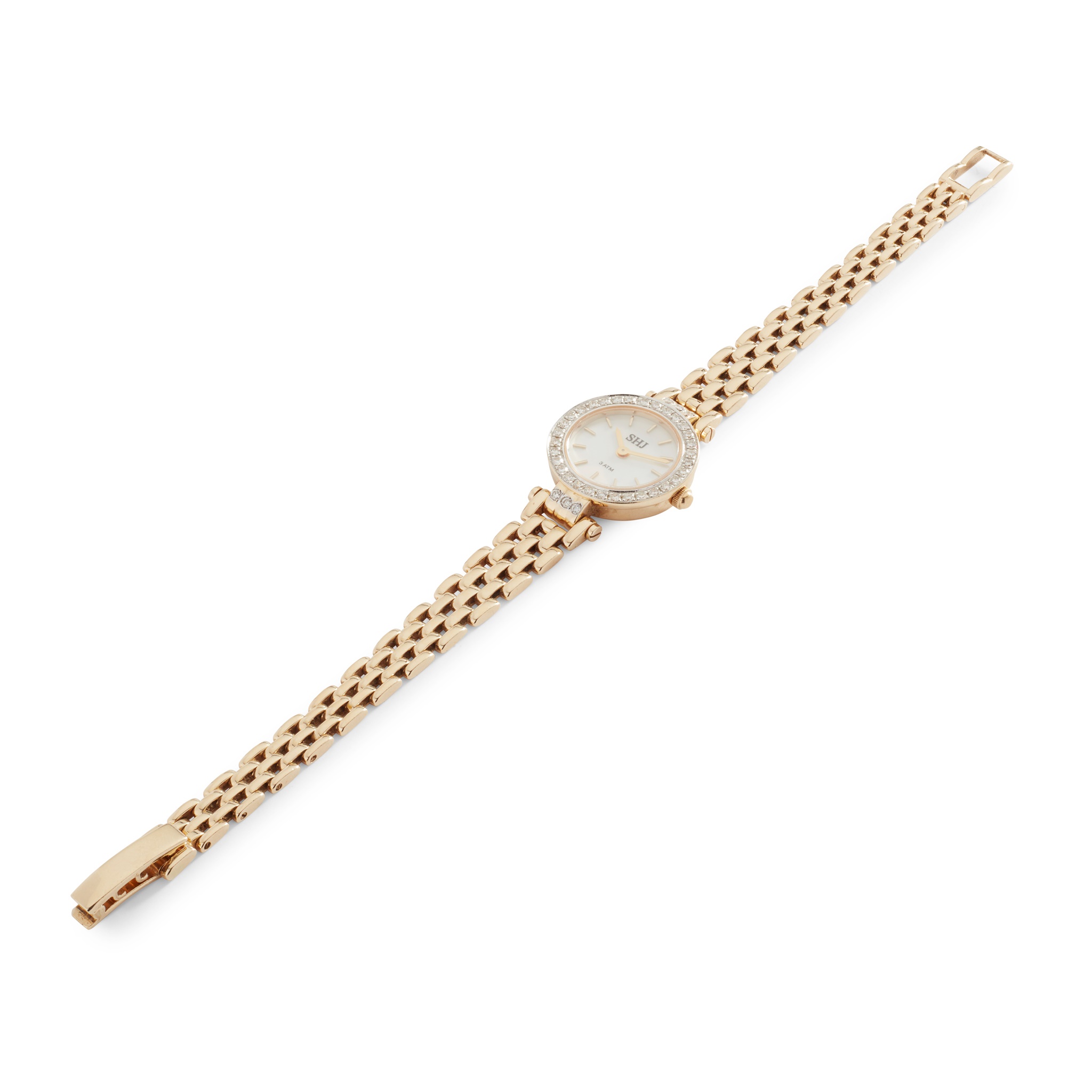 the circular mother-of-pearl dial with baton numerals, the bezel set with round brilliant-cut diamonds, to an integral brick link bracelet
