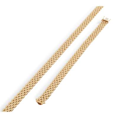 each composed of polished and satin finish brick links, to a concealed clasp with safety clips