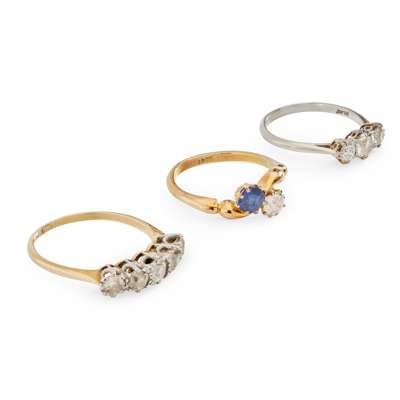 including a five-stone diamond ring, to a plain band; a three-stone diamond ring, stamped 18CT; and a sapphire and diamond two-stone ring, to a plain band