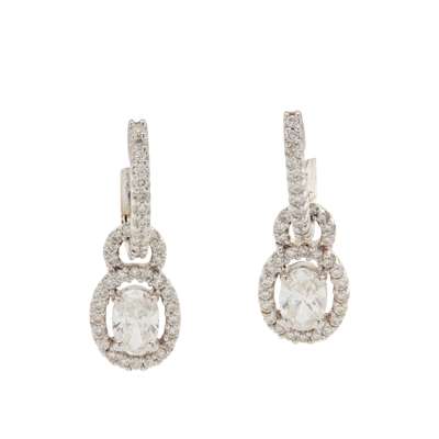 each detachable drop claw-set with an oval-cut diamond in a border of small round brilliant-cut diamonds, suspended from a diamond set bale, mounted in 18ct gold