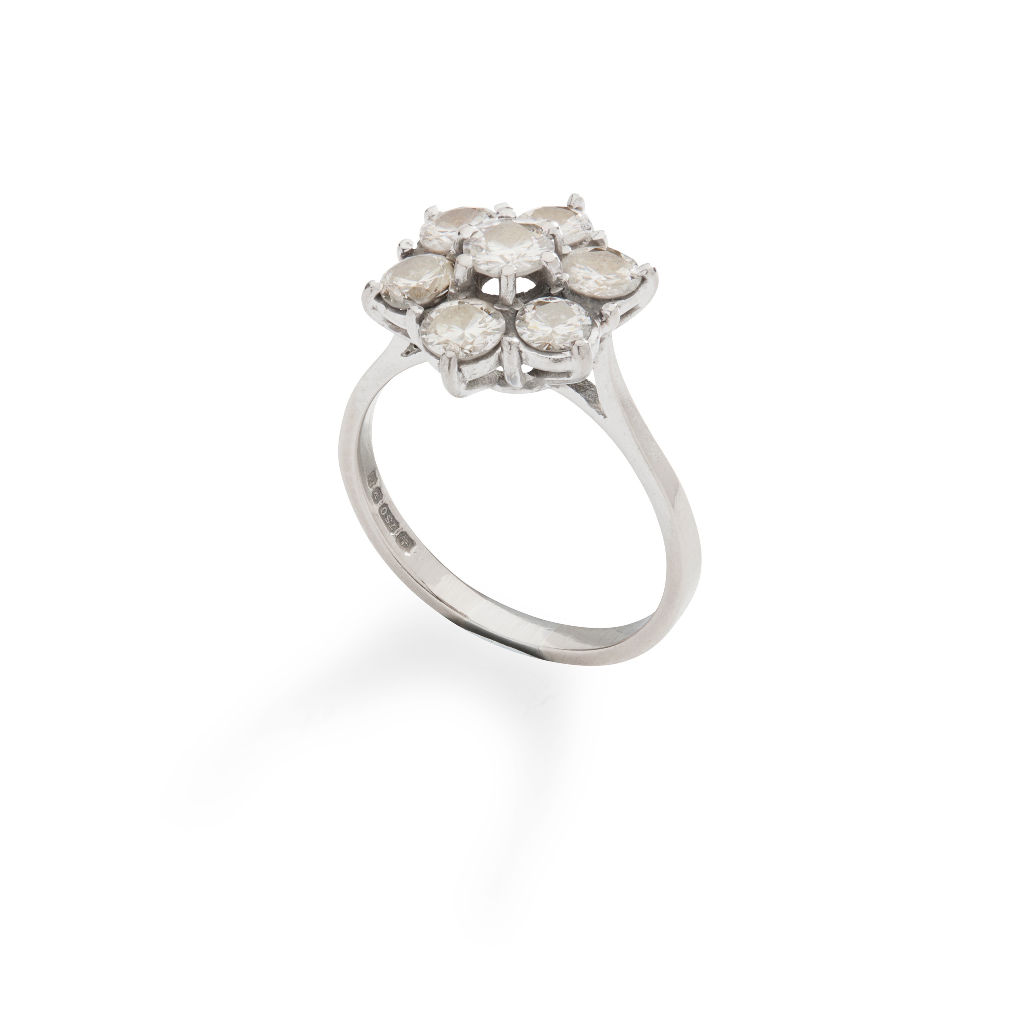 claw-set with seven round brilliant-cut diamonds, mounted in 18ct gold