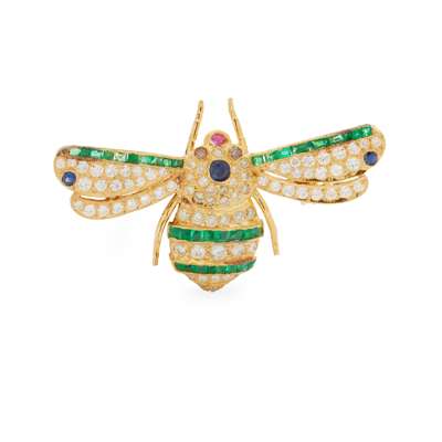 pavé-set throughout with round brilliant-cut diamonds, channel-set rows of square-cut emeralds and collet-set sapphires, unmarked