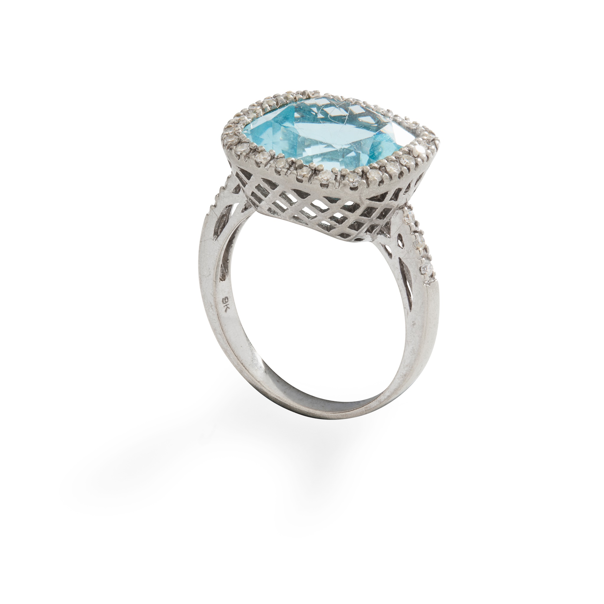 claw-set with a cushion-cut blue topaz, in a border of eight-cut diamonds, each shoulder set with three graduated round brilliant-cut diamonds, mounted in 9ct gold