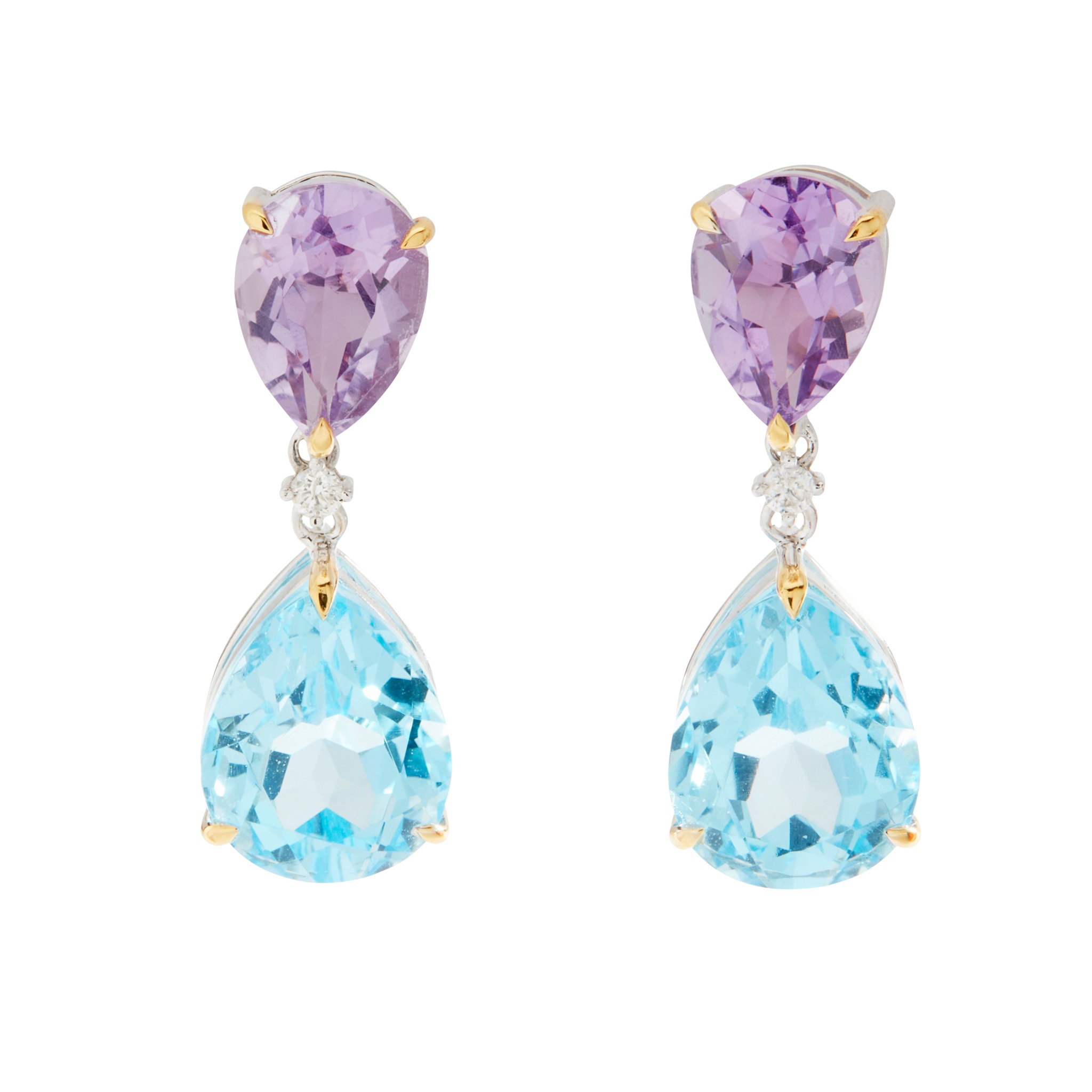 each claw-set with a pear-shaped amethyst, blue topaz and a small round brilliant-cut diamond, to post and butterfly fittings, unmarked