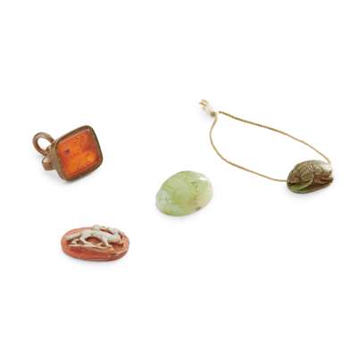 Egypt, New Kingdom, 1550 - 1077 B.C., cast faience, in the form of a scarab beetle, the underside stamped with a cobra (uraeus), reed and hieroglyph of Osiris; also included is an ancient Egyptian-style scarab bearing a cartouche of Rameses II and a pair of Roman-style intaglio