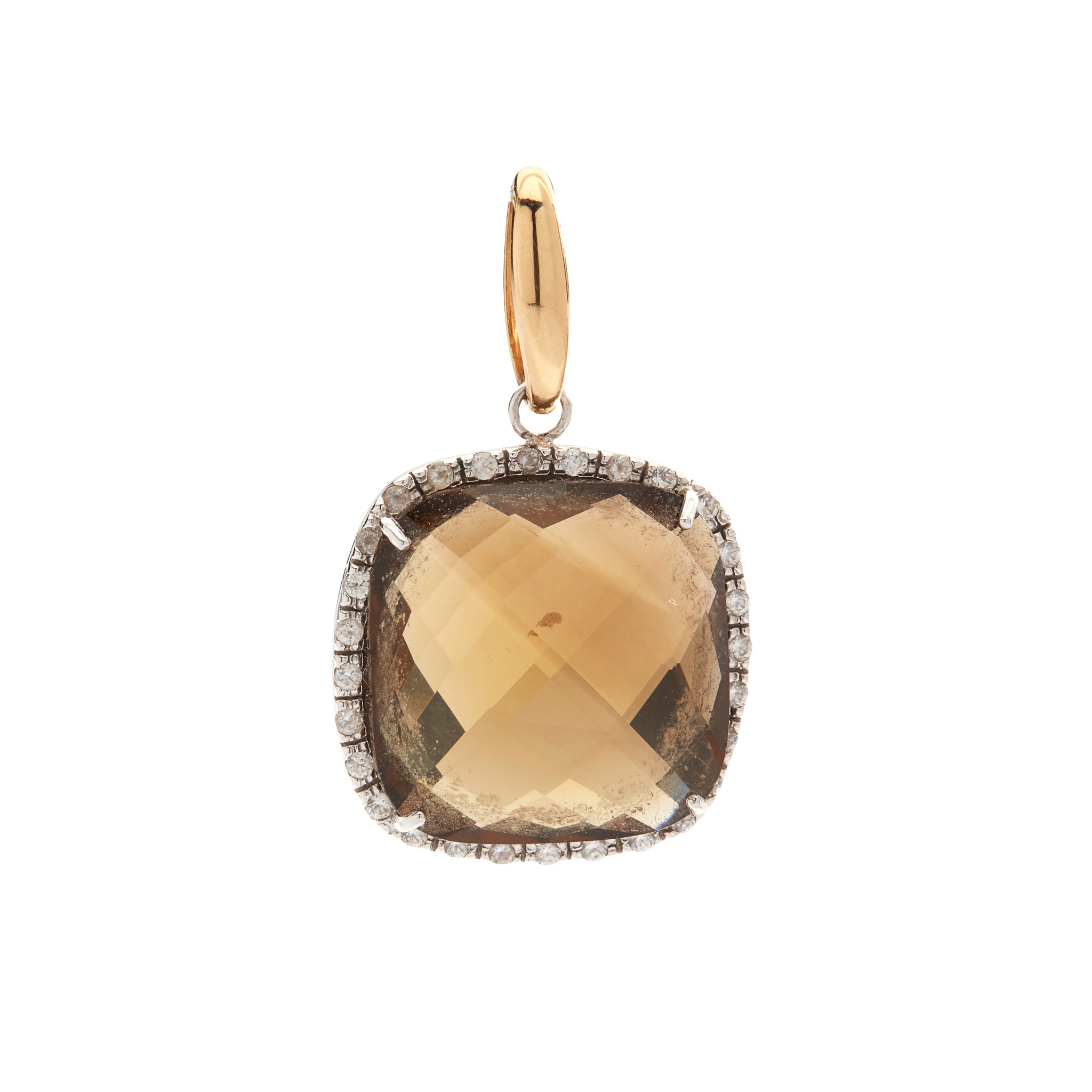 claw-set with a fancy cushion-cut smokey quartz, in a border of round brilliant-cut diamonds, unmarked