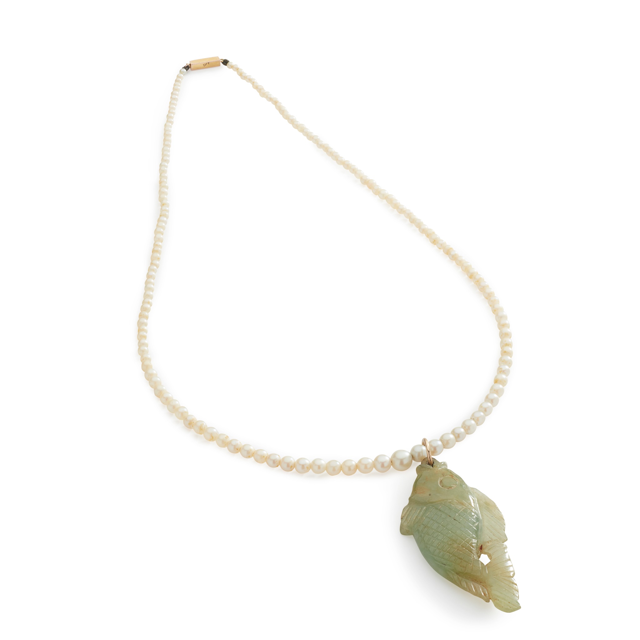 suspending a carved serpentine fish from a strand of graduated cultured pearls, box clasp stamped 9ct