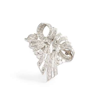 of stylised bow motif, set throughout with old-round, eight-cut and baguette-cut diamonds, unmarked